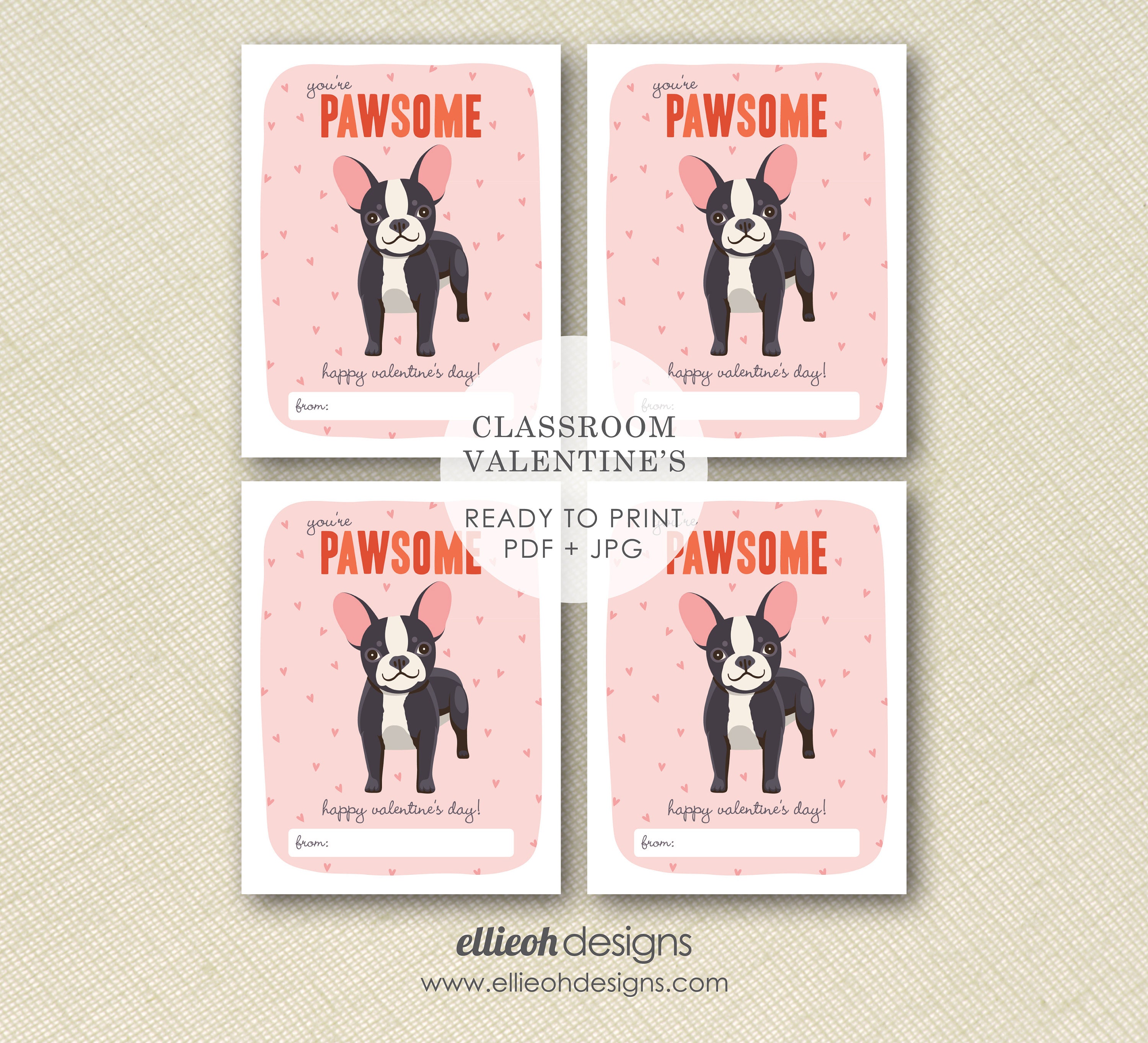 This lovable french bull dog valentine is perfect for classroom parties! The digital file is sized flawlessly for printing on a standard sheet of card stock [8.5x11]. Each valentine will measure 4.25x5.5 inches and will fit perfectly into an A2 envelope. Purchase, download + print in minutes!