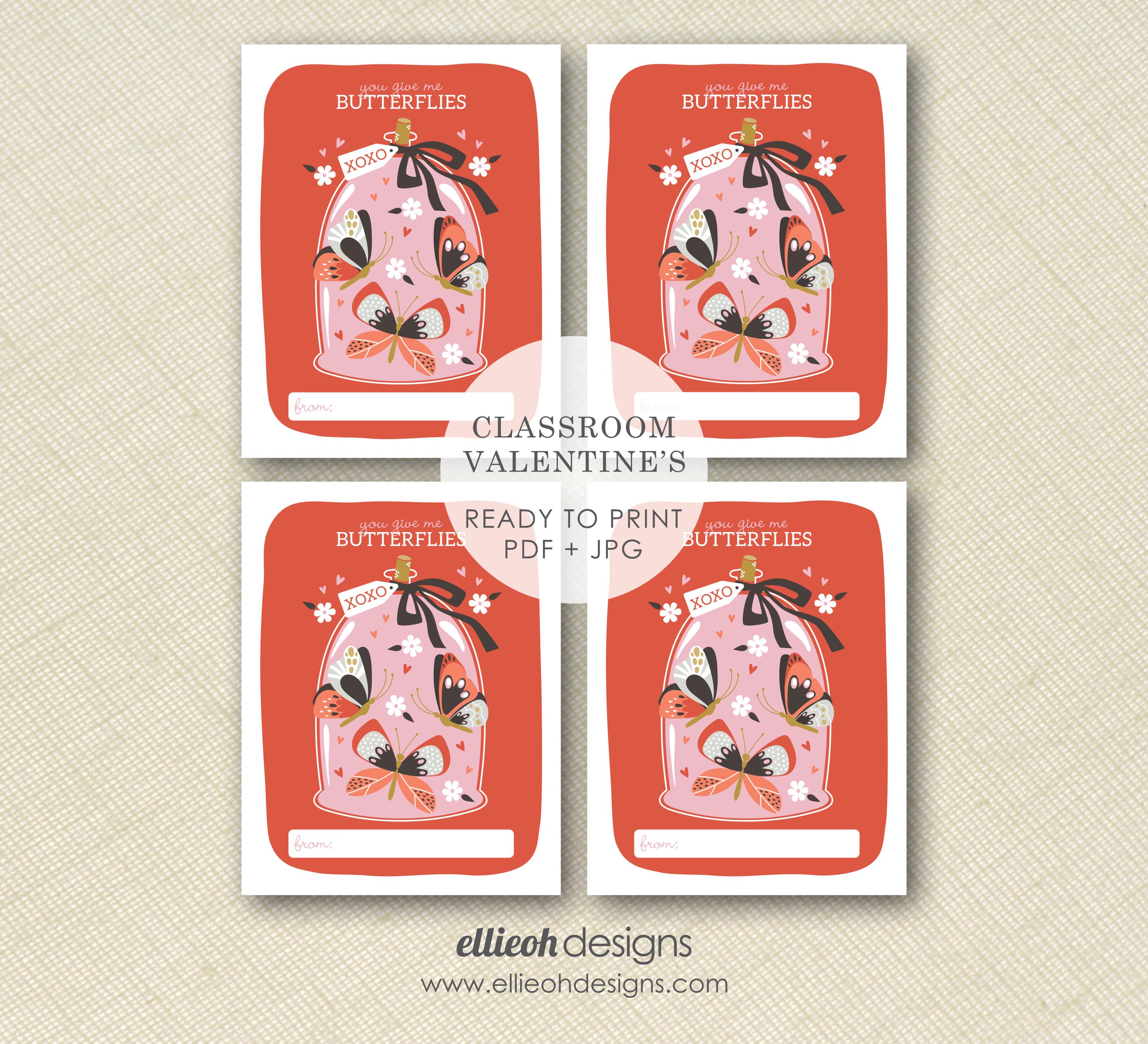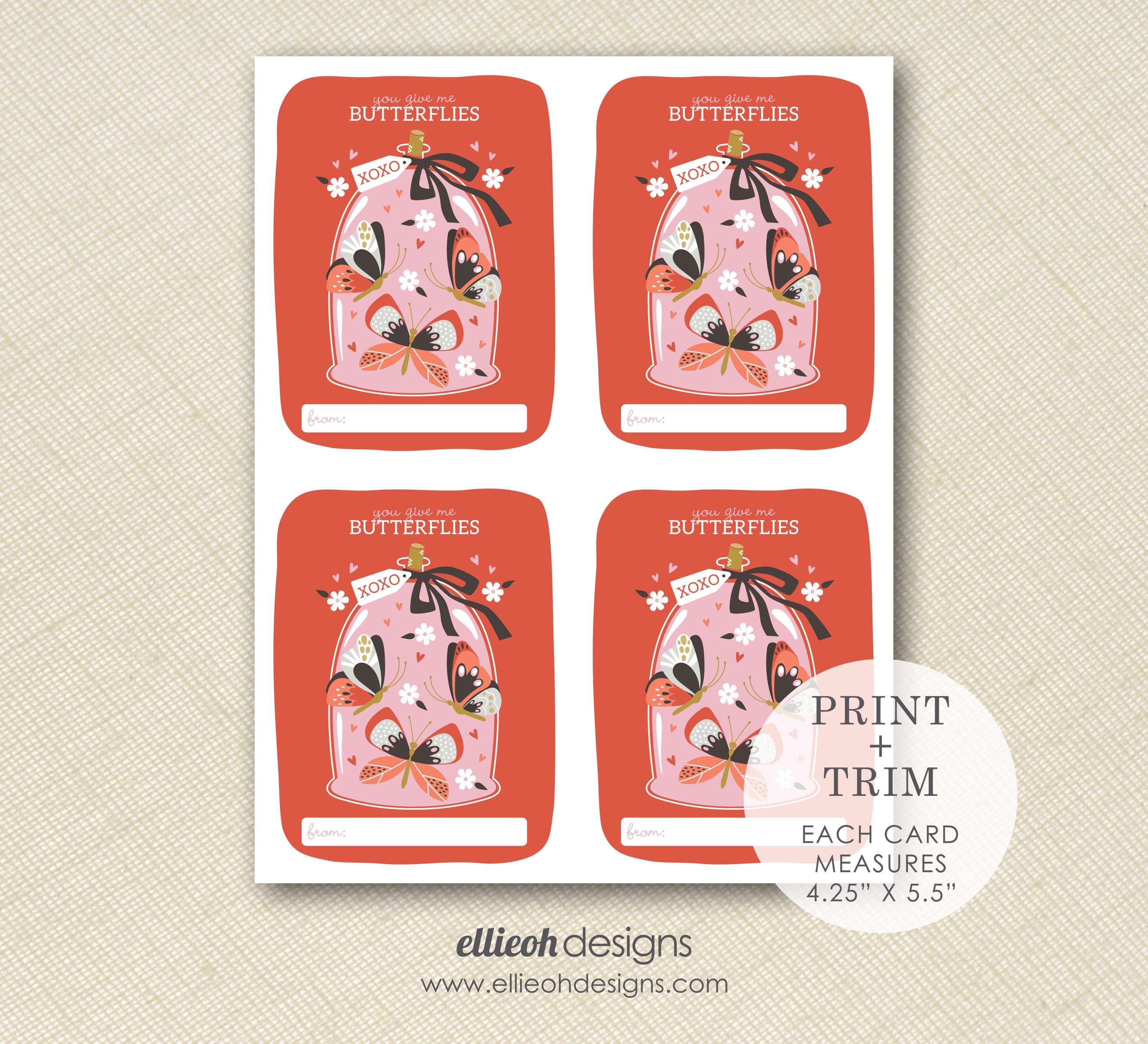 This darling 'you give me butterflies' valentine is perfect for classroom parties! The digital file is sized flawlessly for printing on a standard sheet of card stock [8.5x11]. Each valentine will measure 4.25x5.5 inches and will fit perfectly into an A2 envelope. Purchase, download + print in minutes!