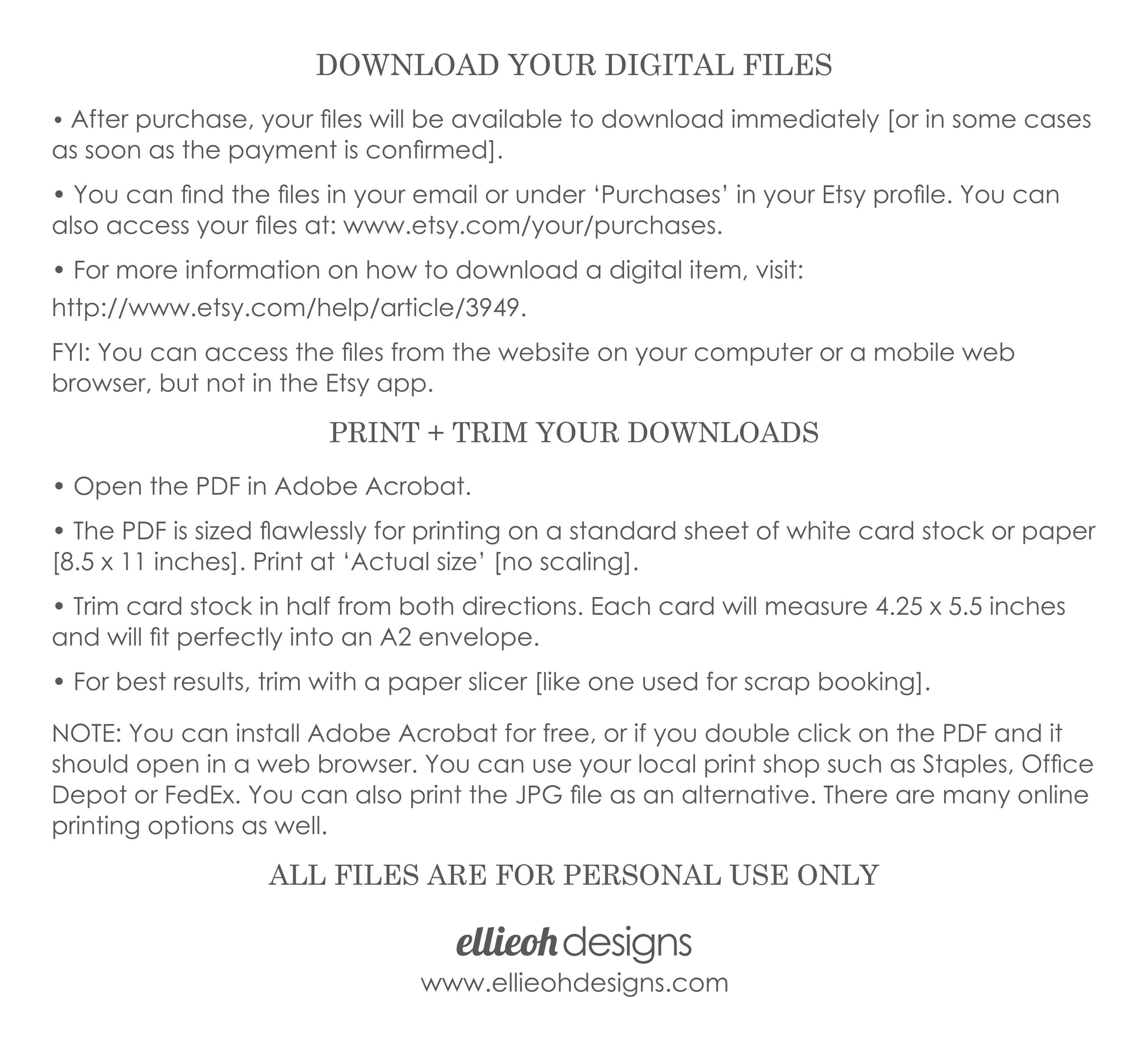 Please note this is an INSTANT DOWNLOAD and not an editable template. Colors may vary between online viewing and your actual printed product. All monitors display color differently; please take this into consideration when placing your order. After purchasing the digital file, simply follow the instructions below to print + trim!