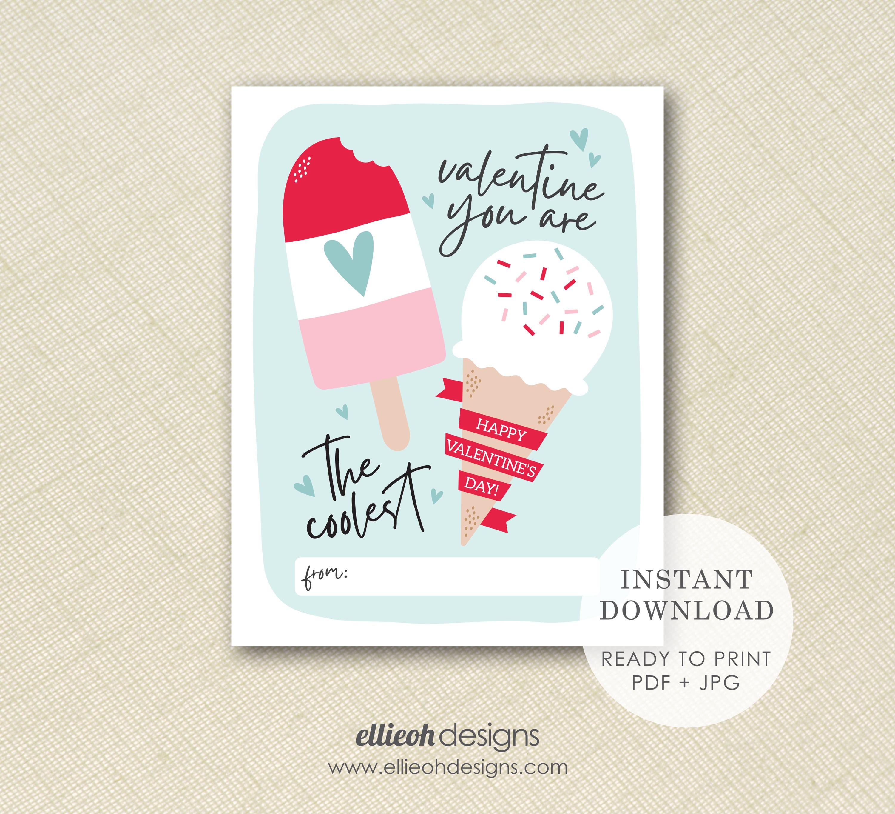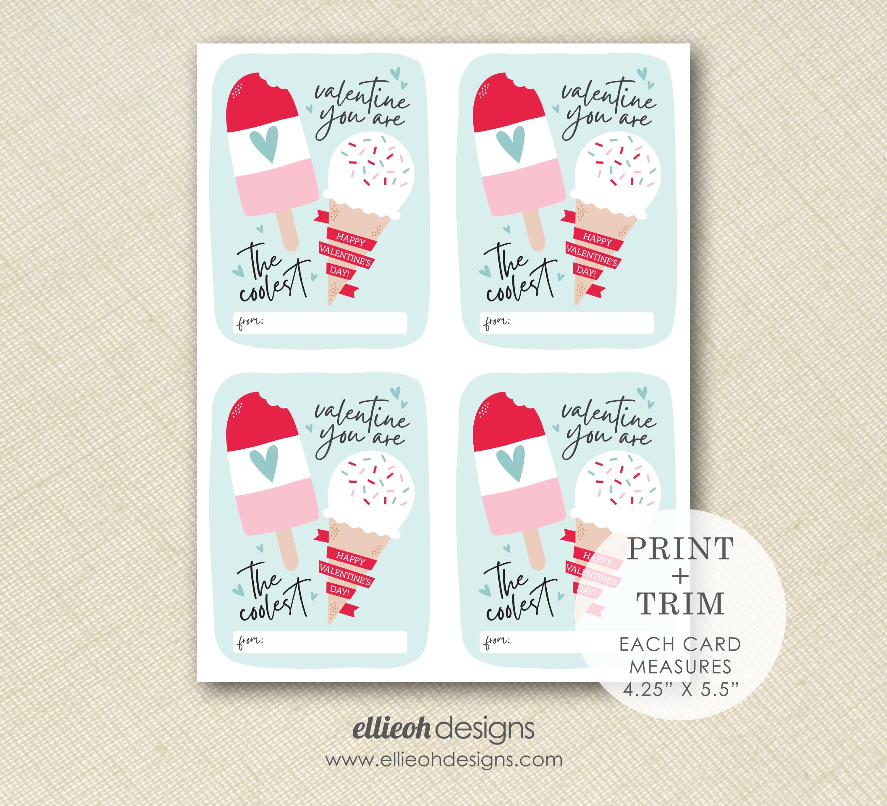 Chill out this Valentine's Day with these cute ice cream themed classroom valentines. The digital file is sized flawlessly for printing on a standard sheet of card stock [8.5x11]. Each valentine will measure 4.25x5.5 inches and will fit perfectly into an A2 envelope. Purchase, download + print in minutes!